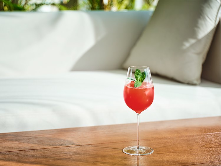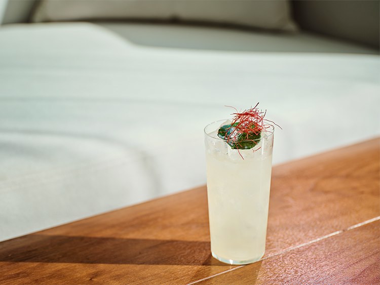 Non-Alcoholic Gin Nema, Muscat syrup, Coco farm Verjus, White Sangria & Mint tea, Kelp, Indian tonic, Lime